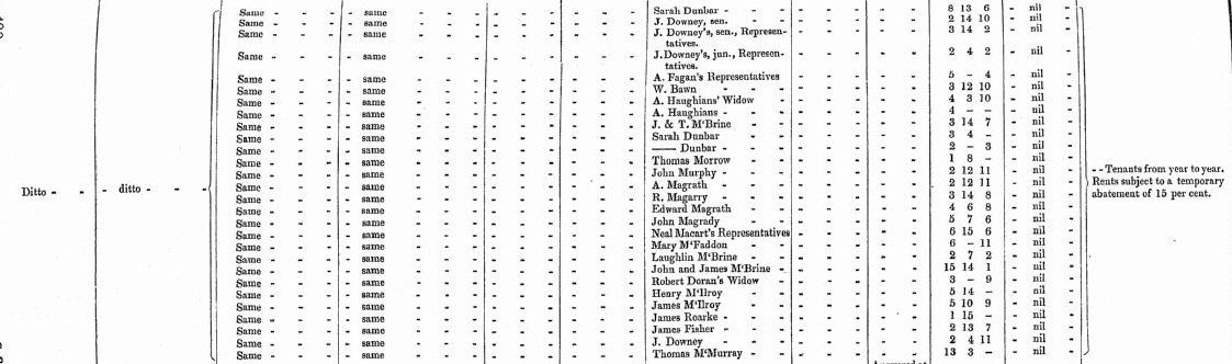 | Loughlin McBrine | John & James McBrine | Robert Dorans widow | Henry McIlroy | James McIlroy | James Roarke |